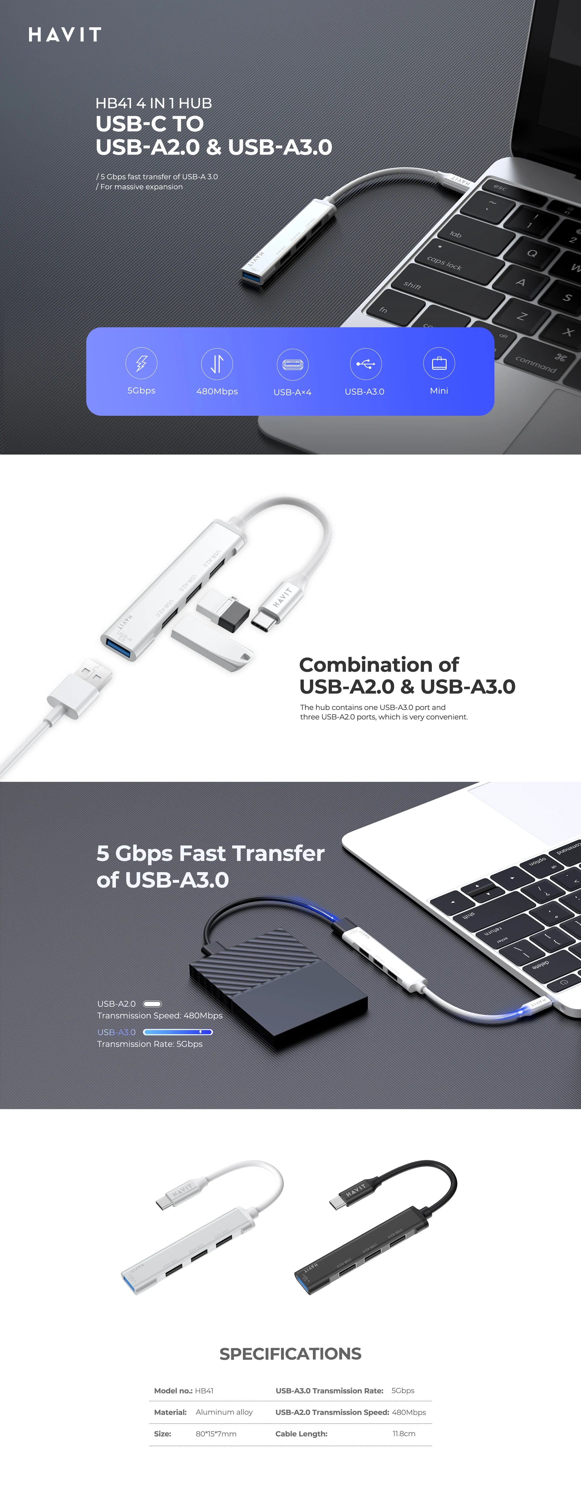 - With the Havit HB41 Type-C Hub, you can expand the capabilities of your device and enjoy seamless connectivity, whether you’re transferring files, projecting your screen, or accessing external media. This hub is a must-have accessory for anyone looking to maximize the potential of their USB-C devices with a single, easy-to-use solution.