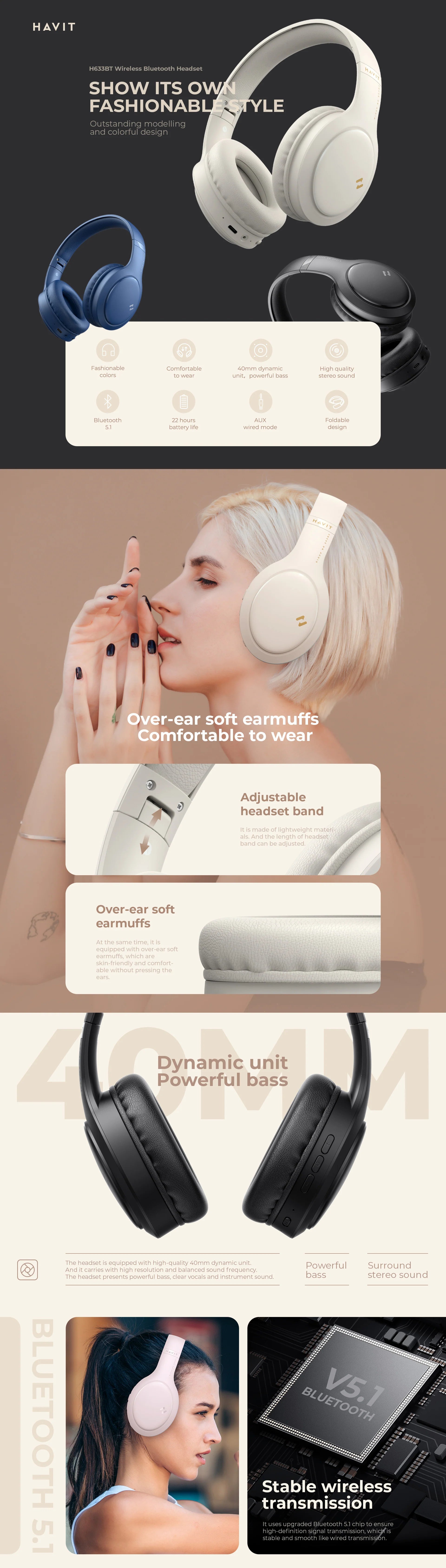 HAVIT Wireless Headphones H633BT-PK Colorful, 20H Playtime, Foldable (Pink)
