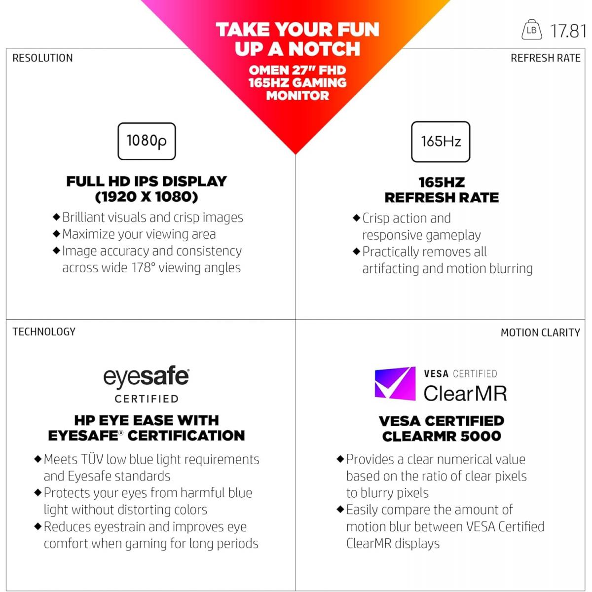 HP OMEN 27 Inch FHD Gaming Monitor 165Hz Eye Ease, Adjustable Stand