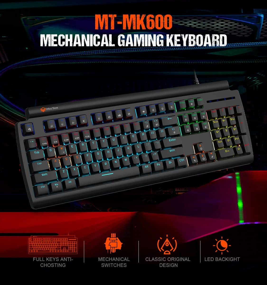 Meetion MT-MK600MX Mechanical Gaming Keyboard, USB, Blue Switch, RGB Backlit